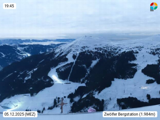 A 5753 Saalbach Hinterglemm 1.070m, Urlaubsort im Pinzgau in dem von Westen nach Osten verlaufenden Tal der Saalach und gehört zur Region der Kitzbüheler Alpen im Bezirk Zell am See. Blick von der Bergstation des Zwölferkogel 1.984m. Präsentiert von https://www.saalbach.com/.