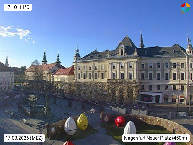 A 9020 Klagenfurt am Wörthersee 446m, ist die Landeshauptstadt des Bundeslandes Kärnten. Blick Richtung Westen zum Rathaus über den Neuen Platz mit dem Lindwurm, dem Wahrzeichen der Stadt Klagenfurt. Präsentiert von https://www.klagenfurt.at:443/.