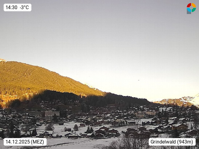CH 3818 Grindelwald 1.034m, eine politische Gemeinde im Amtsbezirk Interlaken des Kantons Bern im Berner Oberland. Der Tourismusort bietet mit dem Wetterhorn 3.692m, Schreckhorn 4.078m, Eiger 3.970m, Mönch 4.107m und Jungfrau 4.158m eine beeindruckende Bergkulisse in den Berner Alpen. Blick vom Dorfzentrum Richtung Süden zum Wetterhorn 3.692m. Präsentiert von https://www.grindelwald.net/.