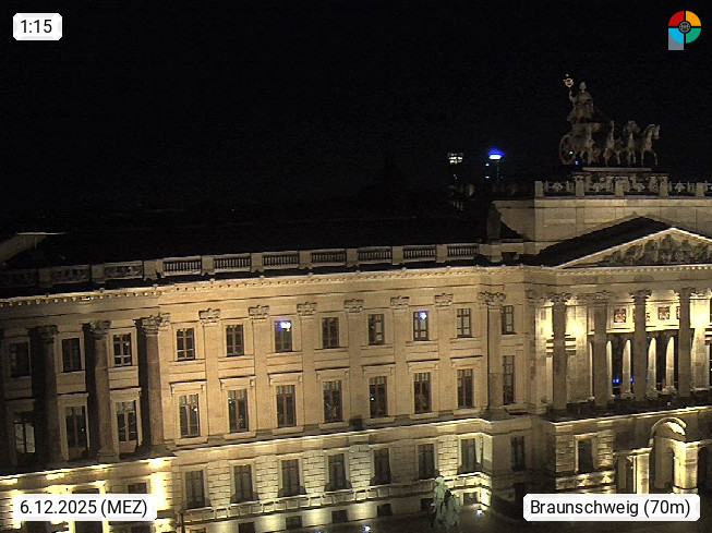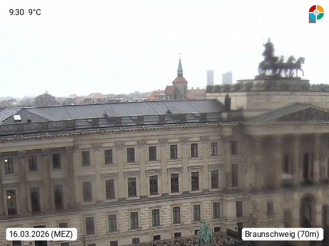 D 38100 Braunschweig 78m, ist eine Großstadt an der Oker im Südosten des Bundeslandes Niedersachsen im nördlichen Harzvorland. Blick vom Rathaus Richtung Südost über den Bohlweg auf das Schloss mit der Quadriga über dem Portal und den Reiterstandbildern auf dem Schlossplatz. Präsentiert von https://www.braunschweig.de.