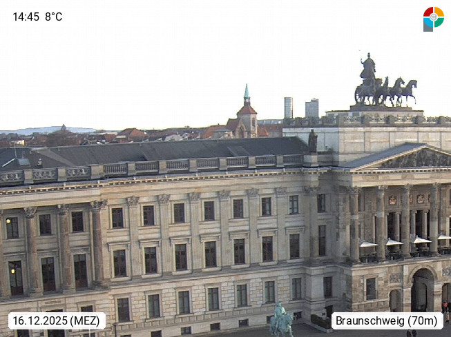 D 38100 Braunschweig 78m, ist eine Großstadt an der Oker im Südosten des Bundeslandes Niedersachsen im nördlichen Harzvorland. Blick vom Rathaus Richtung Südost über den Bohlweg auf das Schloss mit der Quadriga über dem Portal und den Reiterstandbildern auf dem Schlossplatz. Präsentiert von https://www.braunschweig.de.