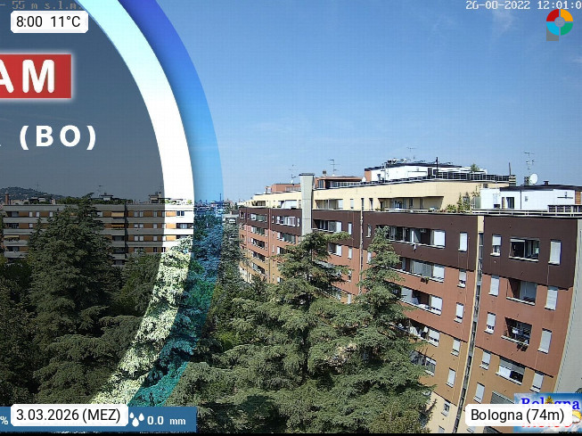 I 40131 Bologna 74m, liegt am Fuße des Apennin zwischen den Flüssen Reno und Savena und ist die Hauptstadt der Region Emilia Romagna und der Provinz Bologna. Blick Richtung Süden zum Stadtzentrum. Präsentiert von https://www.bolognameteo.it/.