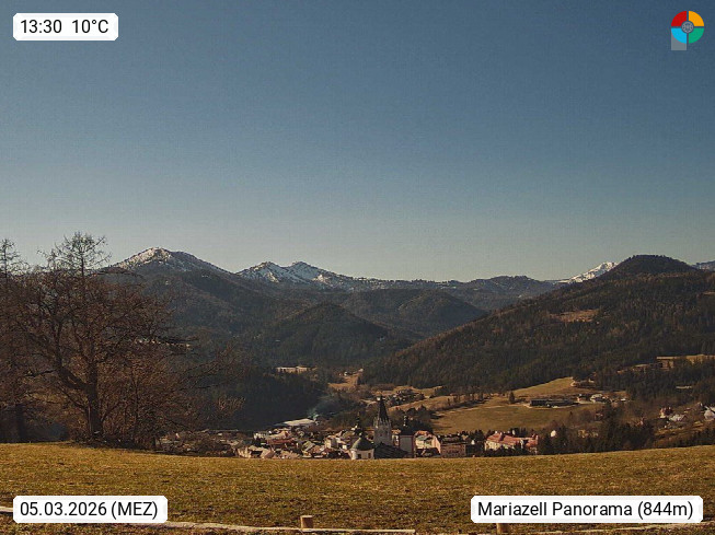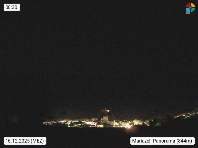 A 8630 Mariazell 868m, wichtigster Wallfahrtsort Österreichs welcher sich in der nördlichen Obersteiermark im Bezirk Bruck an der Mur befindet. Blick von der Volkssternwarte 1.008m, Richtung Westen über Mariazell mit den Türmen der Basilika über das Salzatal zum Zellerhut 1.689m und Dürnstein. Präsentiert von http://www.sbm-web.at.