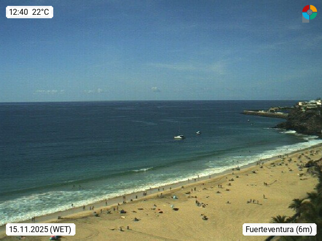 E 35625 Morro Jable 1m, liegt an der Südküste der Kanareninsel Fuerteventura 1.660 km² auf der Halbinsel Jandia und gehört zur Gemeinde Pajara. Blick von der Ferienanlage Coronado Richtung Westen über den Sandstrand zum Atlantischen Ozean. Präsentiert von http://www.solitour.com.