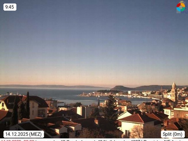 HR 21000 Split 5m, Hafenstadt und zweitgrößte Stadt Kroatiens und Hauptstadt des Bezirkes (Komitat) Split Dalmatien (Splitsko dalmatinska zupanija) an der kroatischen Adriaküste auf der Halbinsel Marjan. Blick Richtung Norden über die Stadt Split. Präsentiert von https://www.meteo.hr.