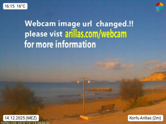Korfu (Kerkyra) 641 km² nördlichste und zweitgrößte der Ionischen Inseln. Blick Richtung Westen über den Strand von Arillas welcher zwischen der Bucht St. George and St.Stefanos im Nordwesten der Insel liegt. PROMOTED BY http://www.panocams.gr. Präsentiert von https://www.arillas.com.