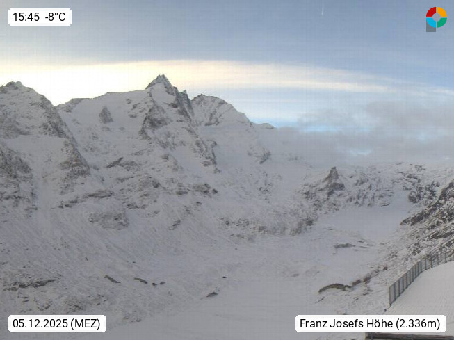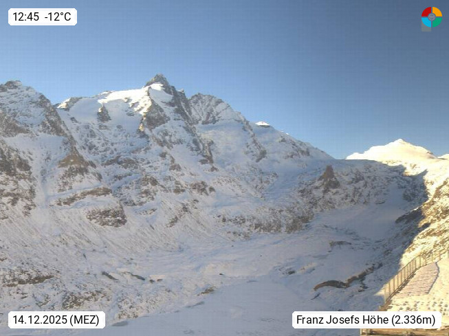 A 9844 Heiligenblut 1.288m am Fuße des Großglockners am obersten Ende des Mölltals im Nationalpark Hohe Tauern und Bezirk Spittal an der Drau, Camstandort Glocknerhaus in 2.132m. Blick Richtung Südwest von der Franz Josefs Höhe 2.362m zum Großglockner, mit 3.798m höchster Berg Österreichs. Präsentiert von https://www.grossglockner.at/de.