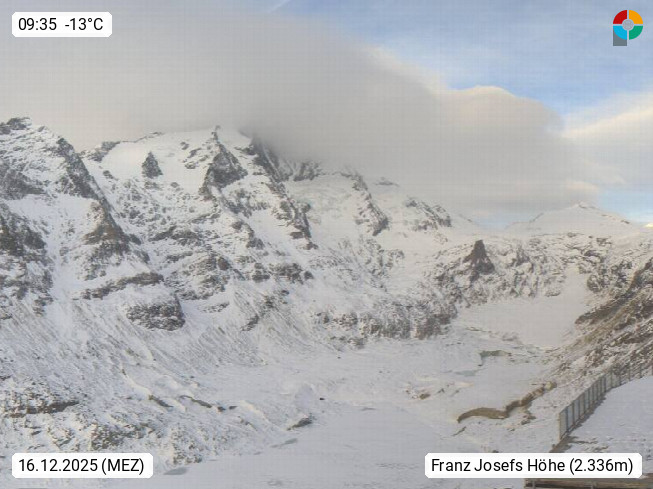 A 9844 Heiligenblut 1.288m am Fuße des Großglockners am obersten Ende des Mölltals im Nationalpark Hohe Tauern und Bezirk Spittal an der Drau, Camstandort Glocknerhaus in 2.132m. Blick Richtung Südwest von der Franz Josefs Höhe 2.362m zum Großglockner, mit 3.798m höchster Berg Österreichs. Präsentiert von https://www.grossglockner.at/de.