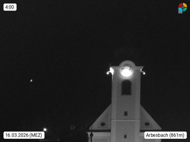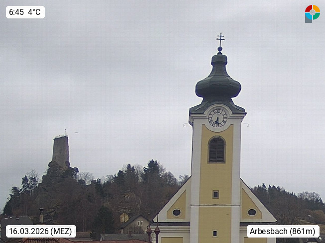 A 3925 Arbesbach 849m, Marktgemeinde im Bezirk Zwettl und Region Waldviertel in Niederösterreich. Blick zur Burgruine 910m und der Pfarrkirche St. Ägidius. Präsentiert von http://www.waldsoft.at.