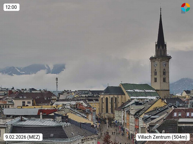 A 9500 Villach 501m, Statutarstadt und zweitgrößte Stadt von Kärnten an der Drau. Blick in die Altstadt mit dem Hauptplatz und der Stadtpfarrkirche St. Jakob in der Altstadt. Präsentiert von https://www.visitvillach.at/.