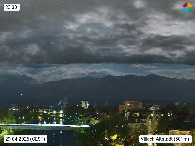 A 9500 Villach 500m, Statutarstadt und zweitgrößte Stadt von Kärnten an der Drau. Blick Richtung Süden über die Draubrücke zur Altstadt. Im Hintergrund die Ausläufer der Karawanken. Präsentiert von https://www.visitvillach.at.