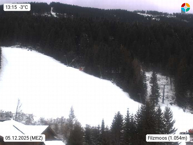 A 5532 Filzmoos 1.054m im Bezirk St. Johann im Pongau am Fusse der Bischofsmütze 2.458m. Blick im Dorfzentrum Richtung Westen zur Papageno Abfahrt vom Rossbrand 1.770m. Präsentiert von https://www.jagdhof.co.at/.