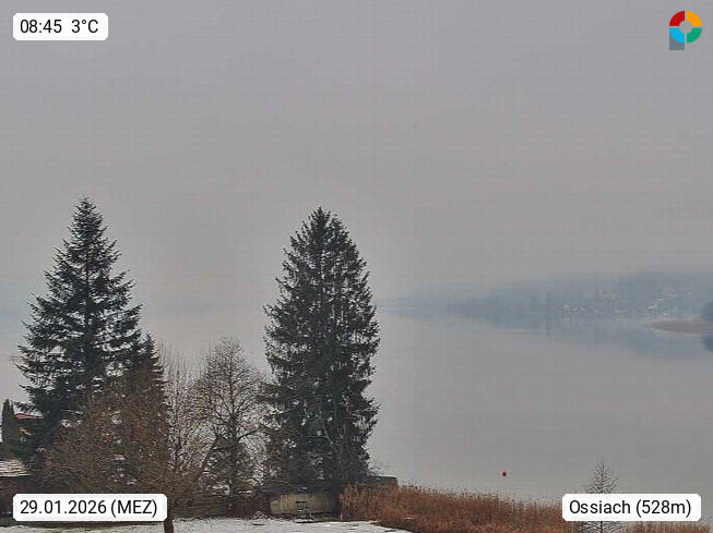 A 9560 Ossiach 510m, Gemeinde am Südufer des Ossiacher Sees. Blick über den See in westlicher Richtung nach Annenheim und der Kanzelhöhe 1.489m. Präsentiert von https://www.visitvillach.at/.