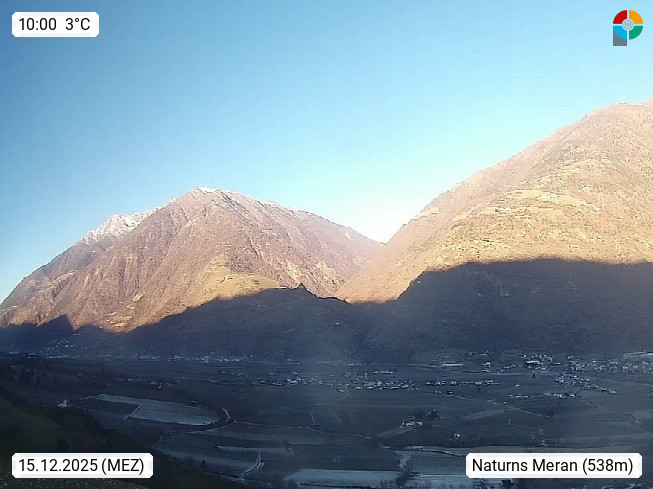 I 39025 Naturns (Naturno) 560m bei Meran (Merano), im Bezirk Burggrafenamt (Burgraviato). Blick vom Hotel Lindenhof zum Naturpark Texelgruppe (Gruppo Tessa) dem grössten Naturpark von Südtirol (Alto Adige) rund 334 km², in südlicher Richtung zur Hohen Warte 2.607m. Präsentiert von https://www.lindenhof.it/.