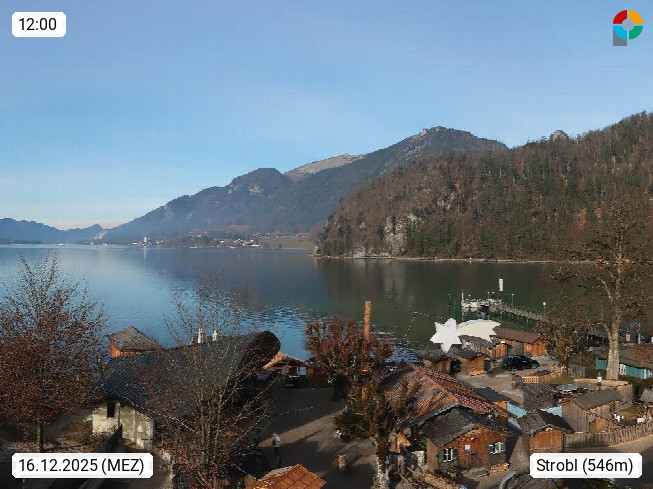 A 5350 Strobl am Wolfgangsee 543m, Gemeinde im Flachgau am Wolfgangsee im Salzburger Salzkammergut. Blick vom Dorfplatz Richtung Norden zur Seepromenade und dem Wolfgangsee 12,8 km². Präsentiert von https://wolfgangsee.salzkammergut.at.