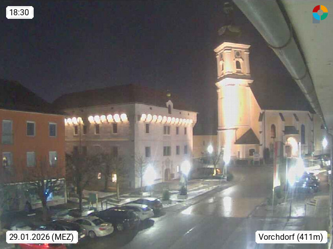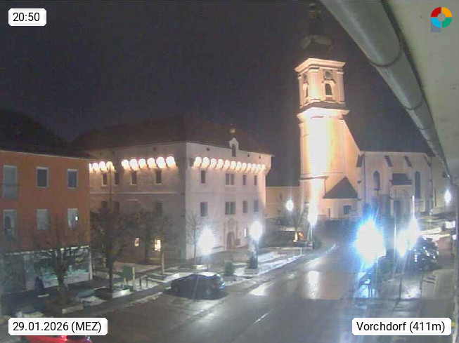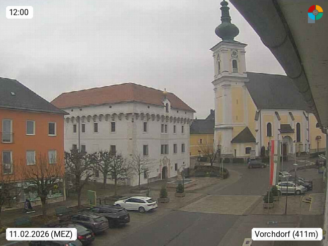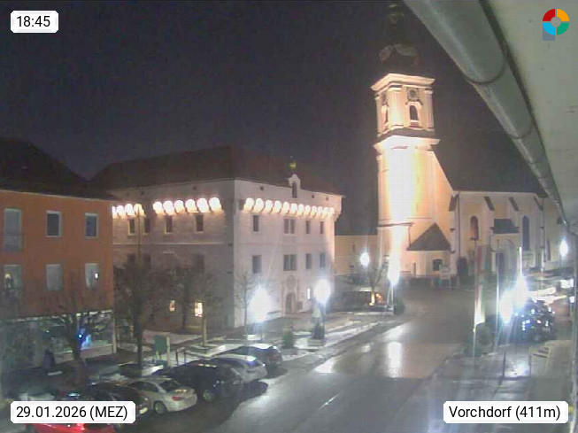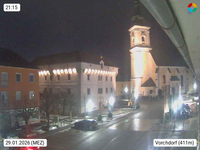 A 4655 Vorchdorf 414m, Marktgemeinde im Bezirk Gmunden im Traunviertel. Blick in nördlicher Richtung über den Marktplatz zur Kirche. Präsentiert von https://www.vorchdorfonline.at/.