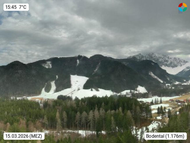 A 9170 Ferlach südlichste Stadtgemeinde Österreichs. Panoramablick über das Bodental, slow. Boden, einem entlegene Hochtal in den Karawanken im Süden von Kärnten. im Hintergrund der Gipel des Vertatscha 2.180 m, einem Grenzberg zwischen Österreich und Slowenien. Präsentiert von https://www.familienhof.at/.