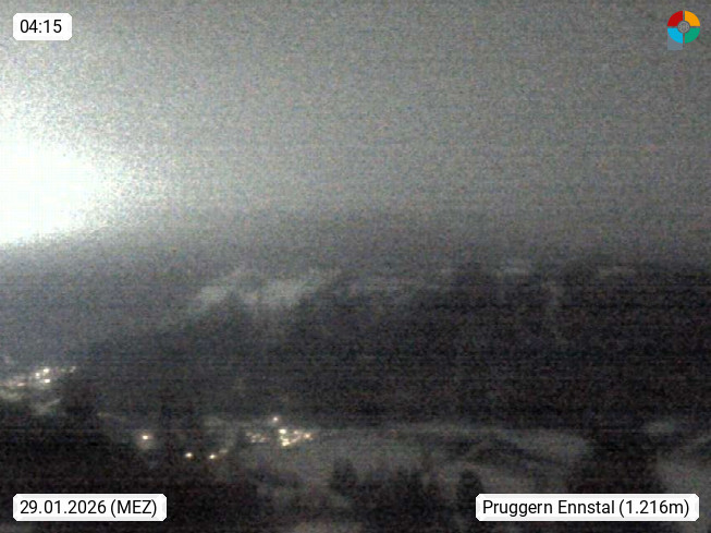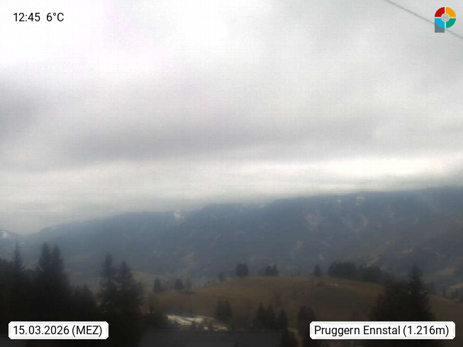 A 8965 Pruggern im Ennstal 690m, Blick vom Hüttenorf in 1.200m Seehöhe Richtung Norden über das Ennstal zum Dachstein 2.995m. Präsentiert von https://www.huettendorf-pruggern.com/.