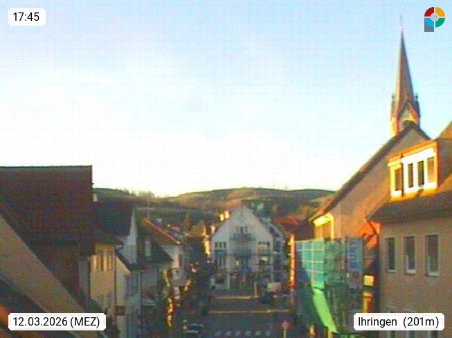 D 79241 Ihringen 202m, liegt im Landkreis Breisgau Hochschwarzwald, im Südwesten Baden Württembergs am Südhang des Kaiserstuhls. Ihringen ist bekannt als Weinanbauort und "wärmster Ort Deutschlands". Blick vom Gemeindeamt über die Bachenstraße Richtung Nord. Präsentiert von https://www.ihringen.de/start.