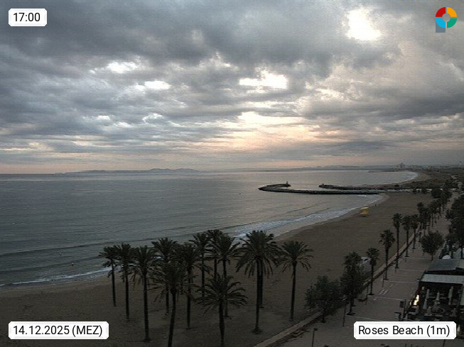 E 17480 Roses (Rosas) an der Costa Brava, Blick Richtung Westen über den Strand. Präsentiert von https://www.roses.net.