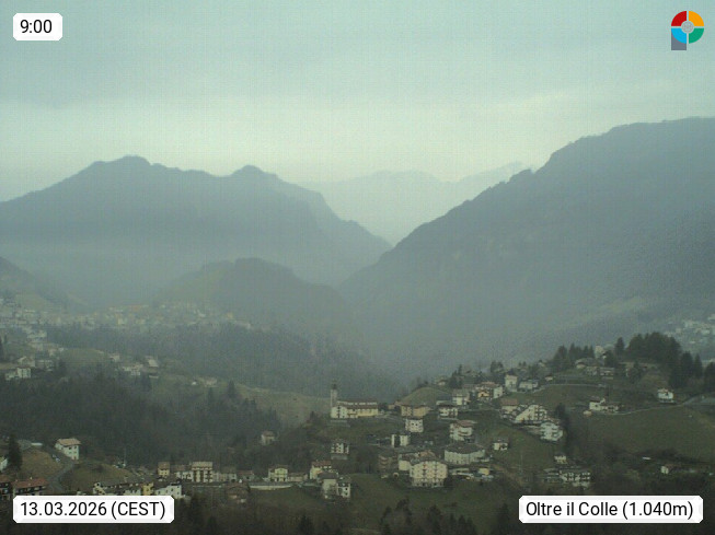 I 24013 Oltre il Colle 1.030m Bergdorf in der Provinz Bergamo rund 20km nordöstlich von Bergamo. Blick von Zambal Alta 1.197m Richtung Süden über den Ort. Präsentiert von https://www.oltreilcolle.com/.