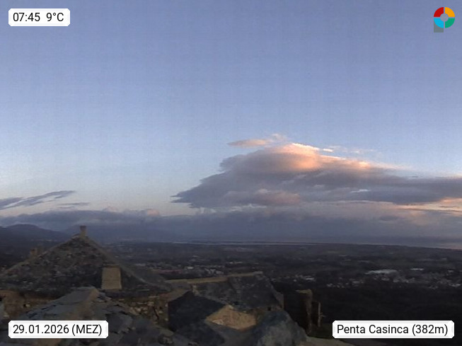 F 20213 Penta di Casinca 400m, Berdorf im Kanton Vescovato im Departement Haute Corse. Panoramablick Richtung Norden bis zum Cap Corse. Präsentiert von https://meteopenta.pagesperso-orange.fr/.