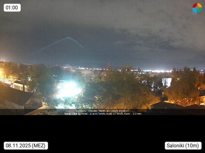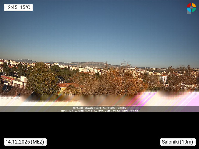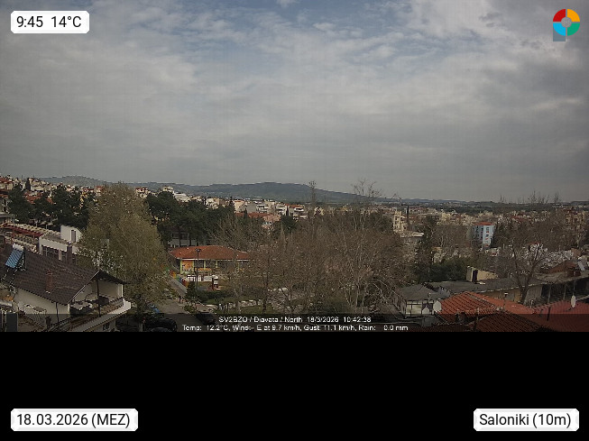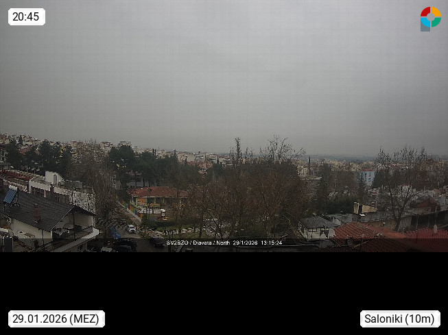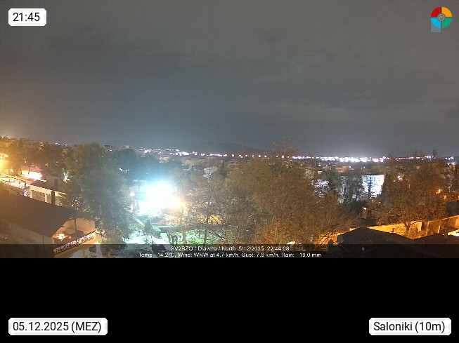 GR 54642 Saloniki (Thessaloniki), zweitgrößte Stadt Griechenlands und Hauptstadt der Verwaltungsregion Zentralmakedonien an den Ausläufern des 1.200 m hohen Chortiatis Gebirges am Thermaischen Golf. Blick Richtung Norden zur Stadt Thessaloniki. Standort http://www.sv2bzq.gr. Präsentiert von http://www.panocams.gr.