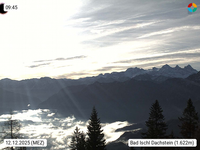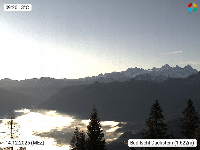 4820 Bad Ischl 468m, Kurort im Zentrum des Salzkammergutes an der Traun im Süden Oberösterreichs. Panoramablick von der Bergstation der Katrinseilbahn 1.418m Richtung Süden zum Dachstein 2.995m mit Dachsteingletscher, links der Hallstättersee, dahinter der Krippenstein 2.109m und rechts Hoher Kalmberg 1.833m. Präsentiert von https://badischl.salzkammergut.at.