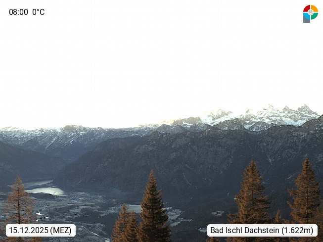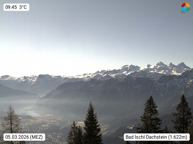 4820 Bad Ischl 468m, Kurort im Zentrum des Salzkammergutes an der Traun im Süden Oberösterreichs. Panoramablick von der Bergstation der Katrinseilbahn 1.418m Richtung Süden zum Dachstein 2.995m mit Dachsteingletscher, links der Hallstättersee, dahinter der Krippenstein 2.109m und rechts Hoher Kalmberg 1.833m. Präsentiert von https://badischl.salzkammergut.at.