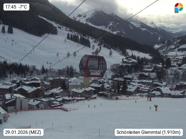 A 5753 Saalbach Hinterglemm 1.003m, Urlaubsort im Pinzgau in dem von Westen nach Osten verlaufenden Tal der Saalach und gehört zur Region der Kitzbüheler Alpen. im Bezirk Zell am See. Panoramablick über die Schönleiten am Asitz Kogel 1.910m im Skigebiet der Skischaukel Saalbach - Leogang, Richtung Westen in das Glemmtal. Präsentiert von https://www.saalbach.com/.