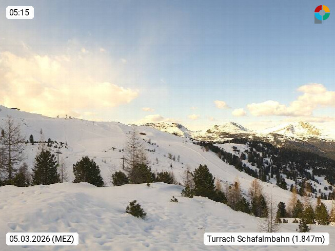 9565 Reichenau, Ski- und Wandergebiet Turracher Höhe in den Gurktaler Alpen und Nockberge an der Grenze zur Steiermark. Blick Richtung Osten zur Bergstation der Schafalmbahn 2.080 m. Präsentiert von https://www.turracherhoehe.at/de.