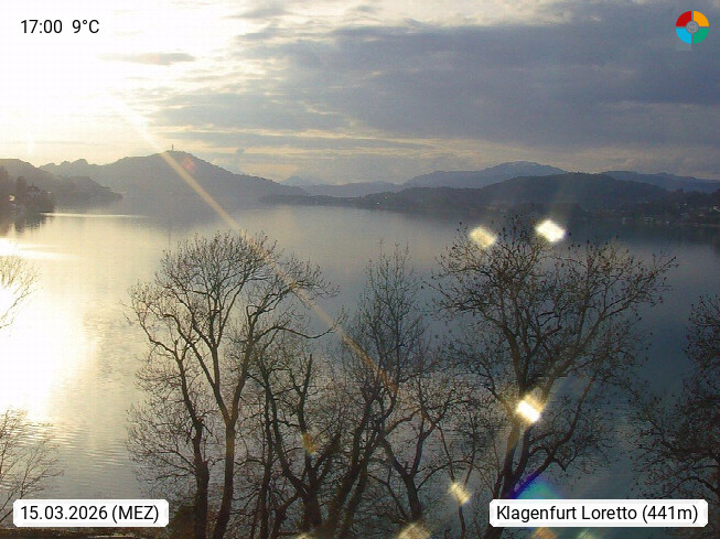 A 9020 Klagenfurt am Wörthersee 446m, Landeshauptstadt des Bundeslandes Kärnten. Blick vom Schloss Loretto Richtung Westen über den Wörthersee bis hin zum Pyramidenkogel. Präsentiert von https://www.klagenfurt.at:443/.
