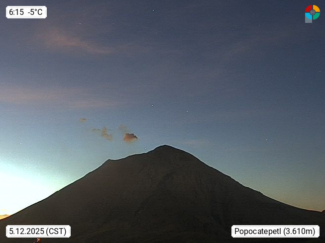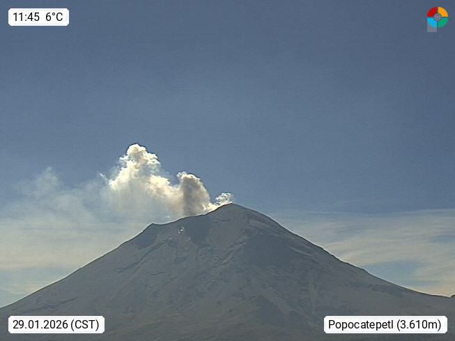 Popocatepetl 5.462 m auch El Popo oder Don Goyo genannt, ist einer der sogenannten Zwillingsvulkane in Zentralmexiko. Sein kleiner Bruder ist der Iztaccihuatl mit 5.286 m. Blick vom Paso de Cortes 3.600 m, Richtung Süden zum Gipfel. Präsentiert von https://webcamsdemexico.net.