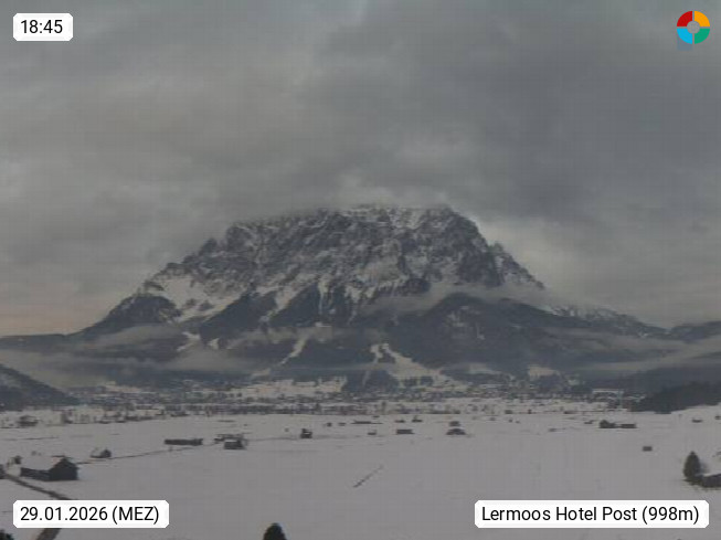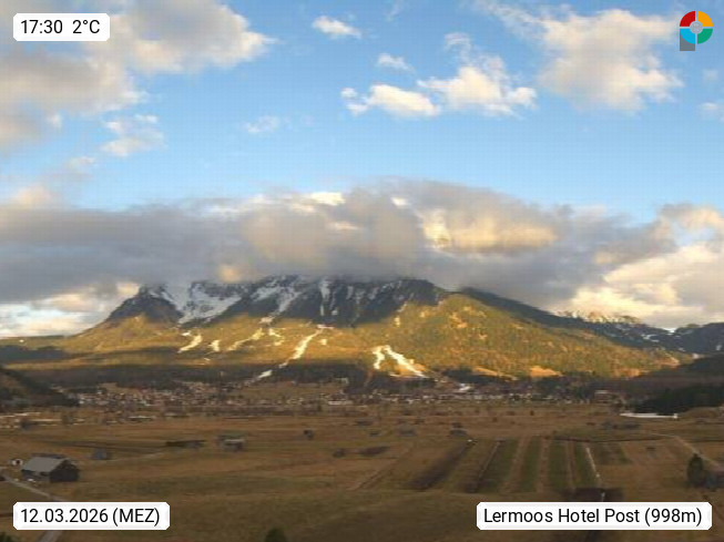 A 6631 Lermoos 1.010m, im Bezirk Reutte im Ausserfern zwischen den Lechtaler und Ammergauer Alpen und dem Wettersteingebirge. Blick vom Hotel Post über die Sonnenterasse in nördöstlicher Richtung über das Moos mit dem Golfplatz Tiroler Zugspitz in der Zugspitz Arena. Im Hintergrund die Zugspitze mit 2.962 m der höchste Berg Deutschlands. Präsentiert von https://www.post-lermoos.at/.