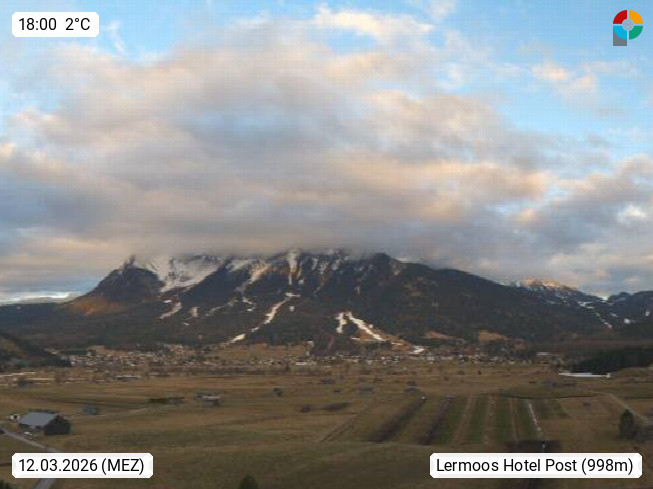 A 6631 Lermoos 1.010m, im Bezirk Reutte im Ausserfern zwischen den Lechtaler und Ammergauer Alpen und dem Wettersteingebirge. Blick vom Hotel Post über die Sonnenterasse in nördöstlicher Richtung über das Moos mit dem Golfplatz Tiroler Zugspitz in der Zugspitz Arena. Im Hintergrund die Zugspitze mit 2.962 m der höchste Berg Deutschlands. Präsentiert von https://www.post-lermoos.at/.
