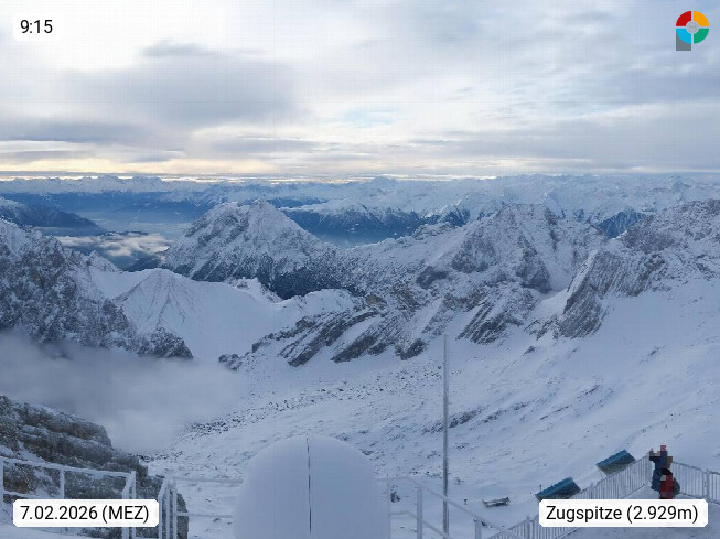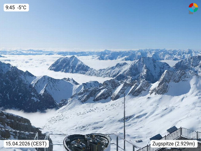 A 6632 Ehrwald im Bezirk Reutte im Ausserfern, Panoramablick von der Tiroler Seite der Zugspitze 2.962m Richtung Südwest auf den Schneefernerkopf 2.874m und das Zugspitzplatt mit Gletscherliften. Nach nur 10 Minuten Fahrzeit von der Talstation Ehrwald Obermoos zur Bergstation 2.950m genießt man von der Aussichtsplattform ein atemberaubendes Bergpanorama. Präsentiert von https://www.zugspitze.at/de/home/.