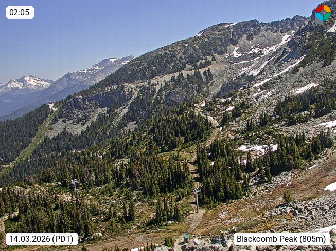 Whistler 680m Wintersportort in der Region Whistler Blackcomb etwa 110 km nordöstlich von Vancouver in British Columbia und größtes Skigebiet in Nordamerika. Blick zur Bergstation in 1.860m am Blackcomb Mountain 2.436m im größten Skigebiet 22 km² in Nordamerika. Durch einen Gletscher ist am Blackcomb auch Sommerskilauf möglich. Präsentiert von https://www.whistlerblackcomb.com/.