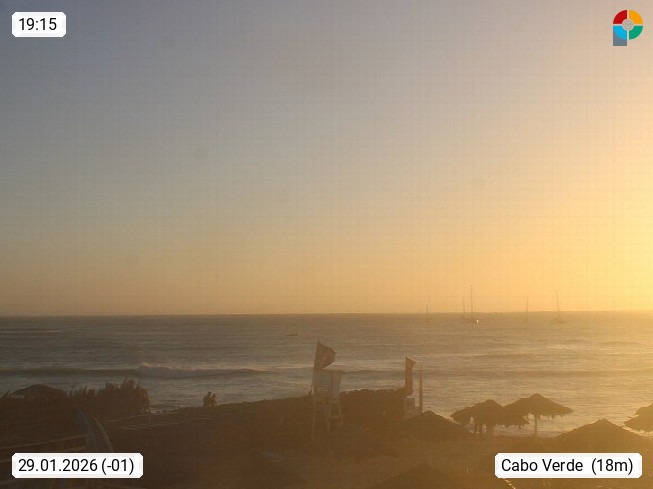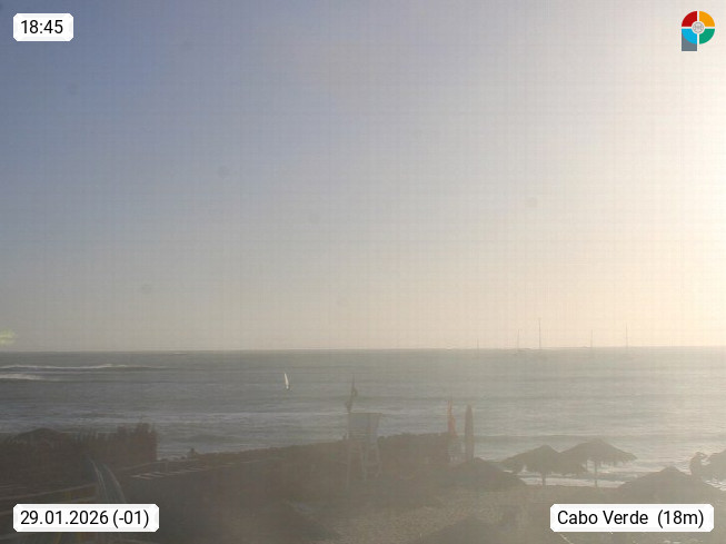 Kap Verde (Cabo Verde), Kapverden, Kapverdische Inseln, ist ein afrikanischer Inselstaat mit insgesamt 15 Inseln, 460 Kilometer vor der Westküste Afrikas. Die Inseln werden unterschieden zwischen den Inseln über dem Wind (Barlavento) und unter dem Wind (Sotavento). Blick über den Strand bei Boa Vista, auf der Insel Sal Richtung Westen. Präsentiert von https://www.addicted-sports.com.