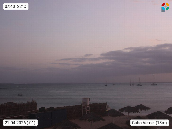 Kap Verde (Cabo Verde), Kapverden, Kapverdische Inseln, ist ein afrikanischer Inselstaat mit insgesamt 15 Inseln, 460 Kilometer vor der Westküste Afrikas. Die Inseln werden unterschieden zwischen den Inseln über dem Wind (Barlavento) und unter dem Wind (Sotavento). Blick über den Strand bei Boa Vista, auf der Insel Sal Richtung Westen. Präsentiert von https://www.addicted-sports.com.