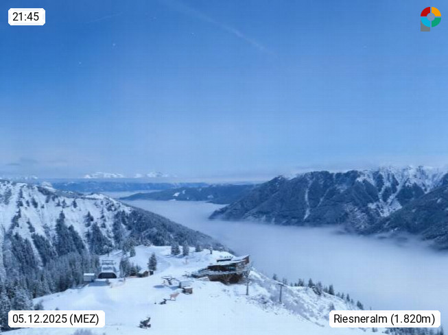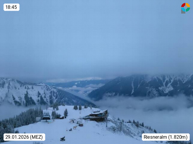 A 8953 Irdning-Donnersbachtal Ortsteil Donnersbach 960m, in den Niederen Tauern im Bezirk Liezen. Blick über die Riesneralm 1.576m am Fuße des Krispen 1.922m und des Hochsitz 1.820m Richtung Südwest. Am Berggasthof Riesneralm beginnt der Kräuterweg und der 1. europäische Gipfelbarfussweg mit der Sonderausstellung UNIVERSUM. Präsentiert von https://www.riesneralm.at/.