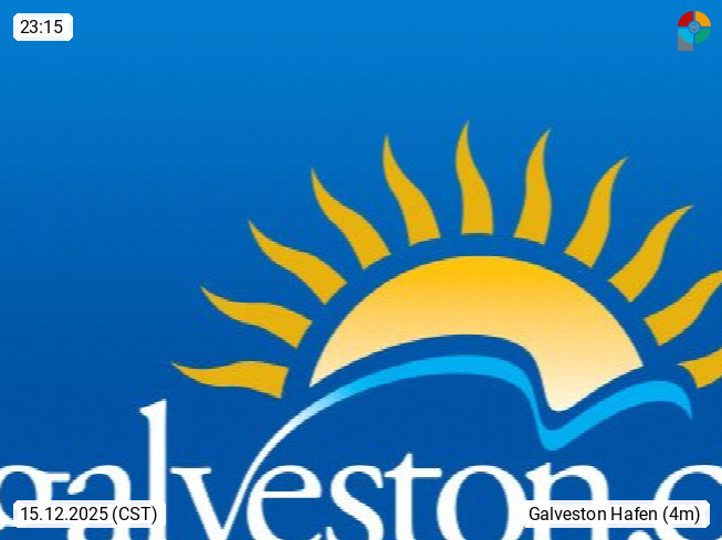 Galveston 3m, Kreisstadt des Galveston County am Golf von Mexiko auf einer der Küste vorgelagerten, lang gestreckten schmalen Insel 119,5 km², die die südliche Grenze der Galveston Bay bildet. Blick Richtung Westen über den Hafen. Präsentiert von https://www.galveston.com/.