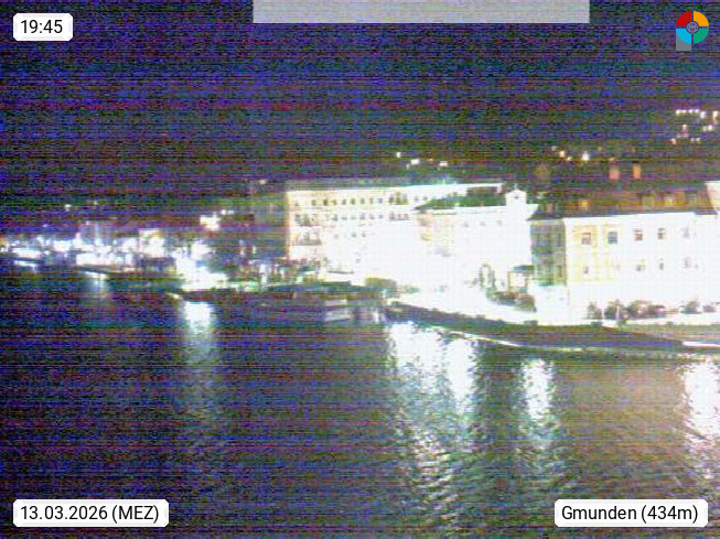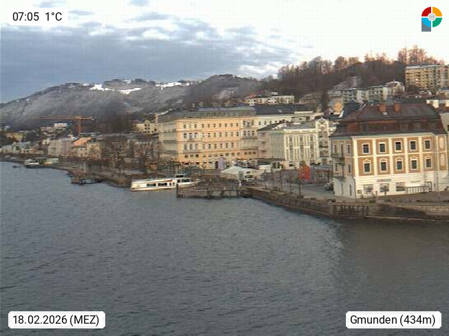 A 4810 Gmunden 425m, Bezirkshauptstadt am Nordufer des Traunsees im Salzkammergut. Blick von der Schiffslände über den Rathausplatz und Esplanade im Stadtzentrum Richtung Westen zum Gmundnerberg 850m. Präsentiert von https://www.reingruber.at.
