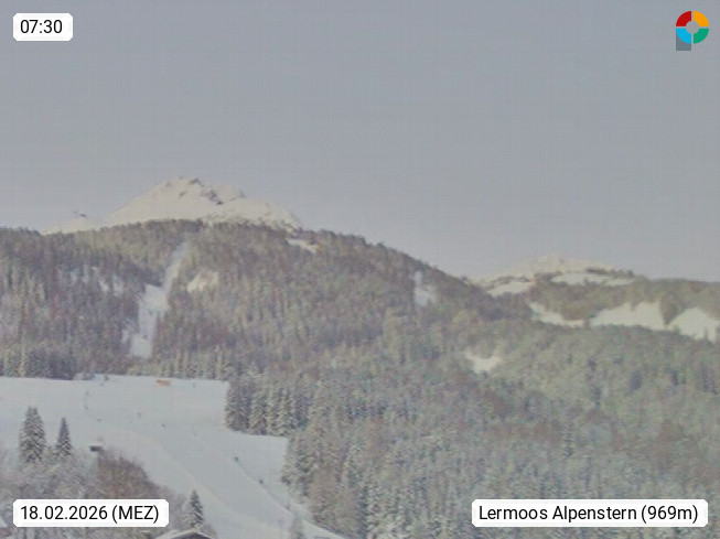 A 6631 Lermoos 1.004m im Bezirk Reute, zwischen Wettersteingebirge, Ammergauer Alpen, Lechtaler Alpen und Mieminger Kette. Blick vom Haus Alpenstern in Richtung Südwest zum Wander und Skiberg Grubigstein 2.233m. Präsentiert von https://www.lermoos.net/.