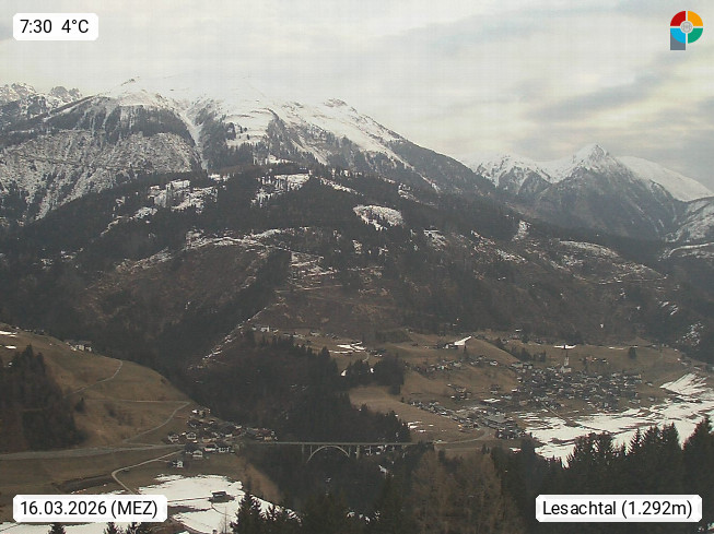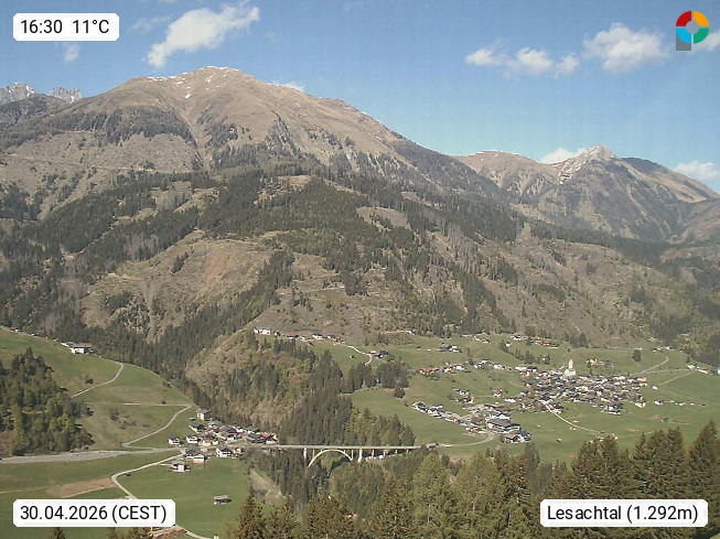 A 9653 St. Lorenzen im Lesachtal 1.044m, neben Liesing, Maria Luggau und Birnbaum einer der vier Hauptorte der Gemeinde Lessach im Bezirk Hermagor. Blick vom Ort Frohn Richtung Nordost, links der Ort Wiesen, die Brücke über den Radegrundgraben, rechts St. Lorenzen im Lesachtal. Präsentiert von https://www.kelag.at/.