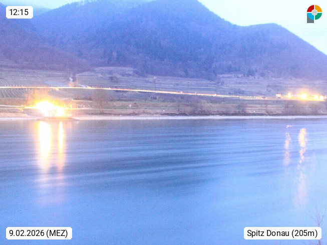 A 3620 Spitz and der Donau 227m, Marktgemeinde am linken Donauufer in der Wachau im Bezirk Krems Land. Blick von Spitz stromabwärts Richtung Osten über die Fähranlegestelle zum Ort Arnsdorf am rechten Donauufer. Präsentiert von https://www.derbusch.at/.