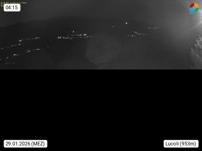 I 67045 Lucoli 956m, Gemeinde in der Provinz L Aquila im Apennin. Blick Richtung Westen zum Valle del Rio und Monte Monito mit den Bergdörfern Prata, Peschiolo und Santa Groce. Präsentiert von http://www.lucoli.it.