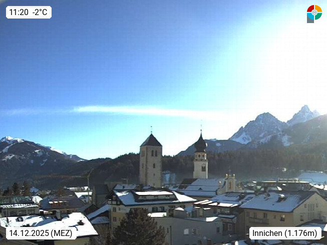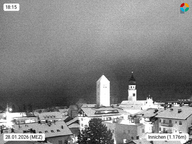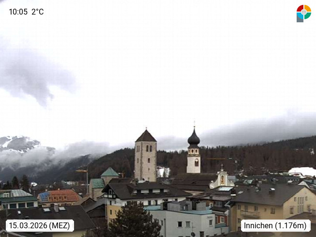 I 39038 Innichen (San Candido) 1.175m an der Drau im Pustertal an der Grenze zu Osttirol (Tirolo Orientale) in Österreich. Blick vom Sporhotel Tyrol im Ortszentrum, im Bild mit der romanischen Stiftskirche Richtung Osten, zum Helmplateu 2.050m am Helm (Monte Elmo) 2.434m. Präsentiert von https://www.sporthoteltyrol.it/de/4-sterne-superior-hotel-innichen.html.