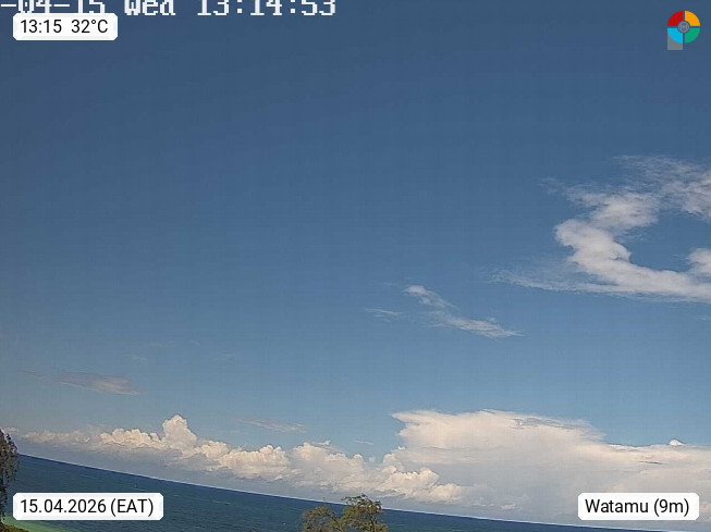Watamu, Ort an der Turtel Bay am indischen Ozean südlich der Stadt Malindi in der Provinz Coast. Blick entlang des Strandes Richtung Süden. Präsentiert von https://webcams.aeroclubea.com/.