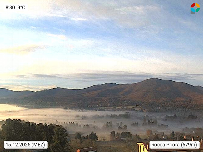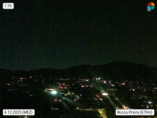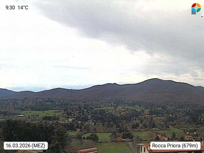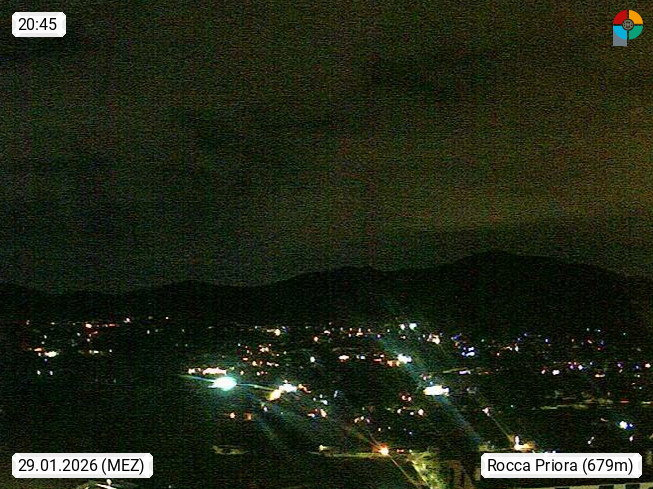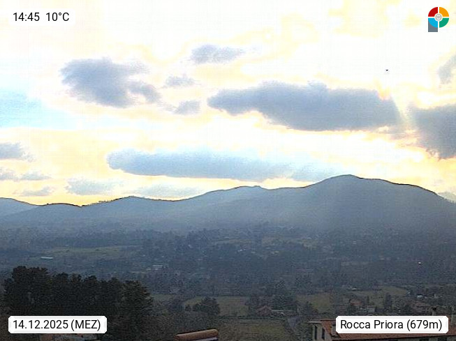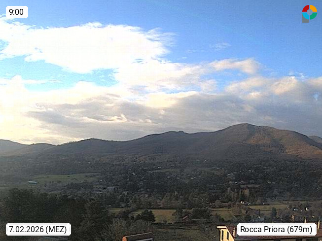 I 00040 Rocca Priora 700m, Gemeinde der Casteli Romano in der Region Latium rund 25 km südöstlich von Rom am Rande der Albaner Berge. Panoramablick Richtung Süden zum Monte Pennolo, Sarapullero und Cavo. Präsentiert von https://www.meteoroccapriora.it/.