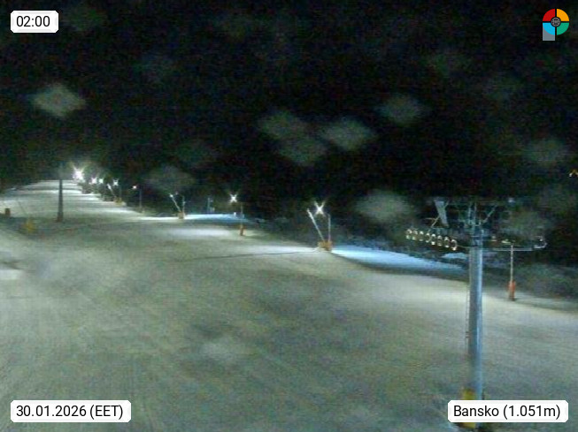 Bansko 990m, Stadt am Fuße des Piringebirges in der Oblast Blagoewgrad nahe der Stadt Raslog im Südwesten von Bulgarien. Blick über den Bereich der Talstation der Skilifte. Präsentiert von https://www.banskoski.com/bg.